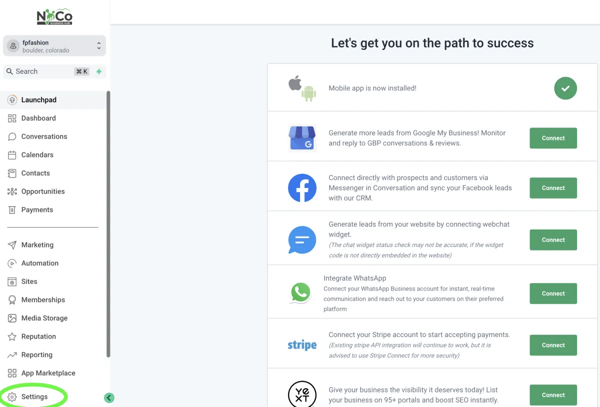 Upon first login, the first screen you will see is the Launchpad. The Launchpad will prompt you to complete a number of important integrations, which we'll get to later. The first thing we're going to do is look for the settings button in the lower left side of the side-menu, and click that.