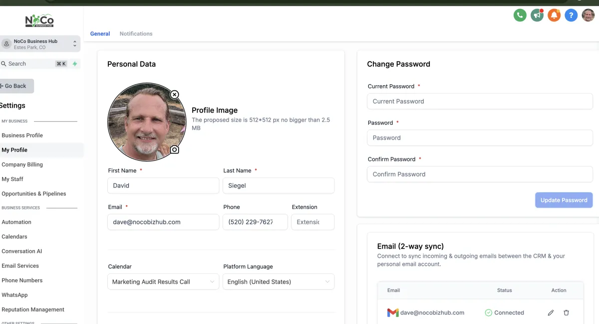 Calendar settings - same as email. If you will use the system to enable online bookings, this will sync your availability with the calendars you link it to